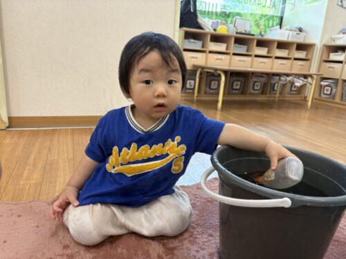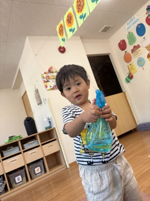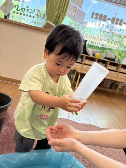 かき氷のシロップの空き容器にお水を入れて、先生の手に出して遊んでいました😊