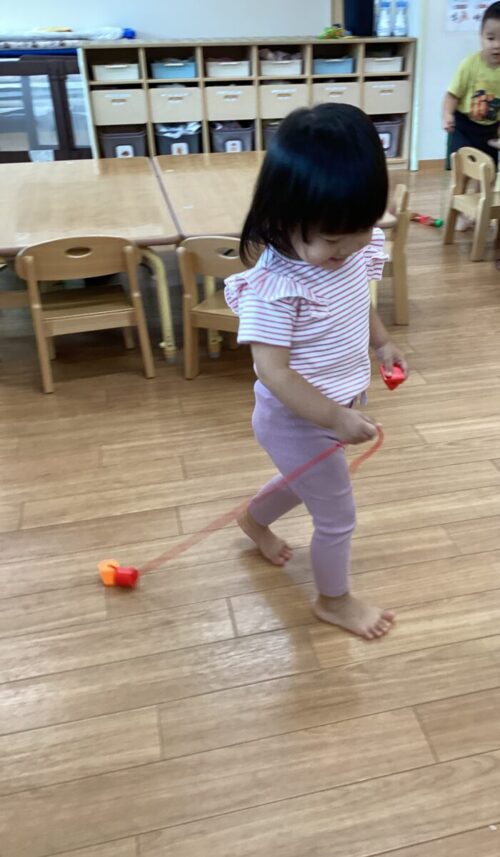 今日は牛乳パックの積み木とひも通しで遊びました!