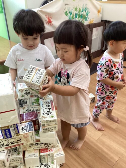 ぶどう組さんを待っている間、もも組さんは牛乳パックの積木で遊びました☺️
