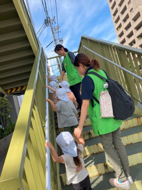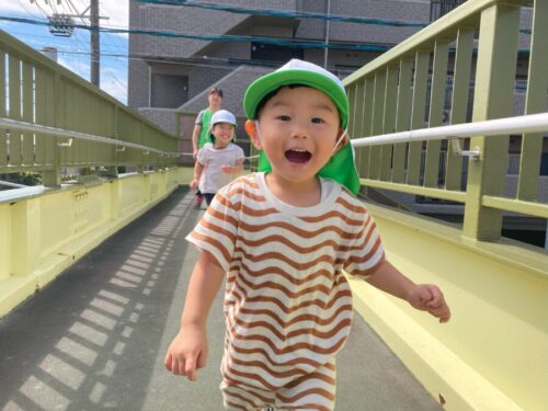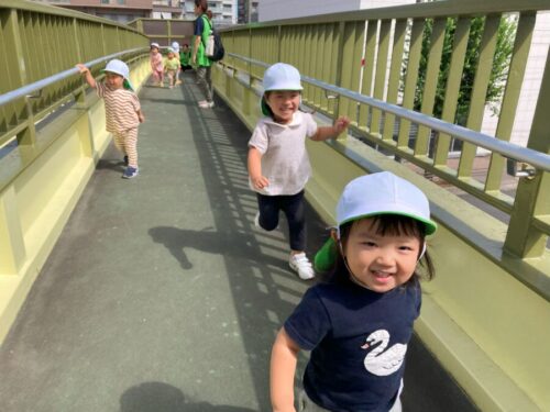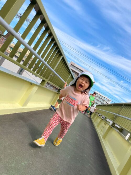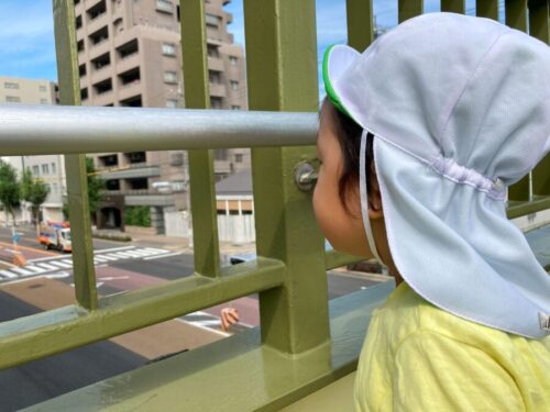避難訓練のあとは、歩道橋まで行って走ってくる車に手を振ったり、走ったりして楽しみました🚌