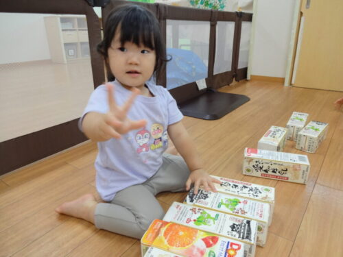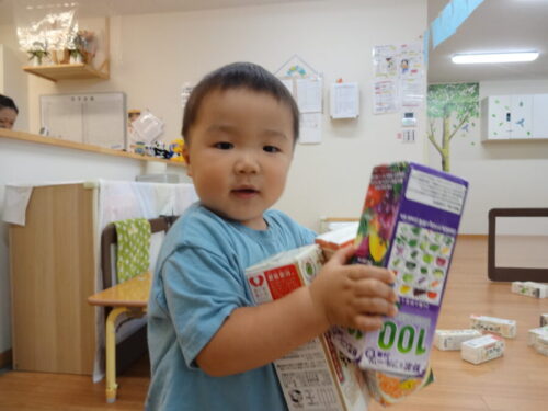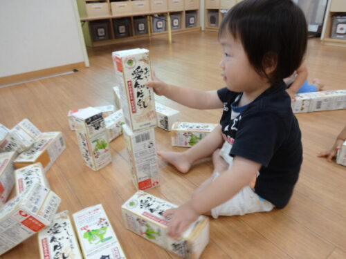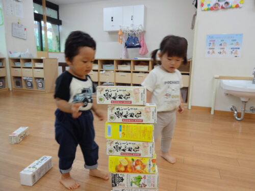 お部屋の中で、牛乳パックの積み木で遊びました♬