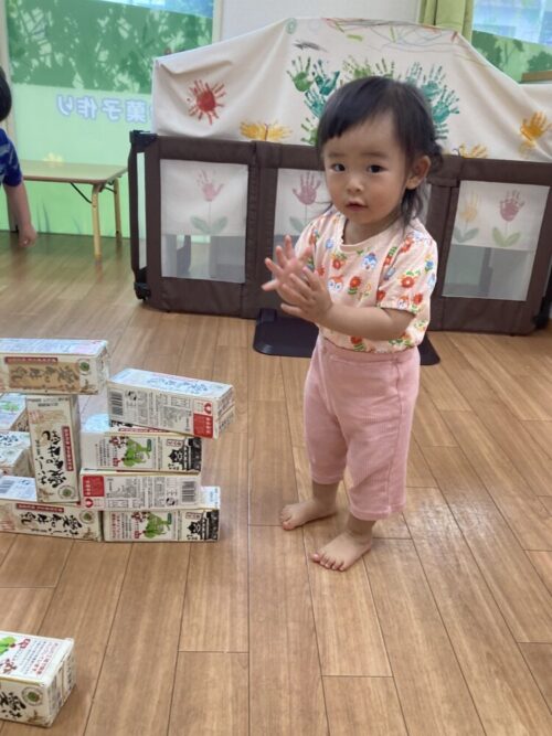 今日は、お部屋で牛乳パックの積み木とぬりえで遊びました!