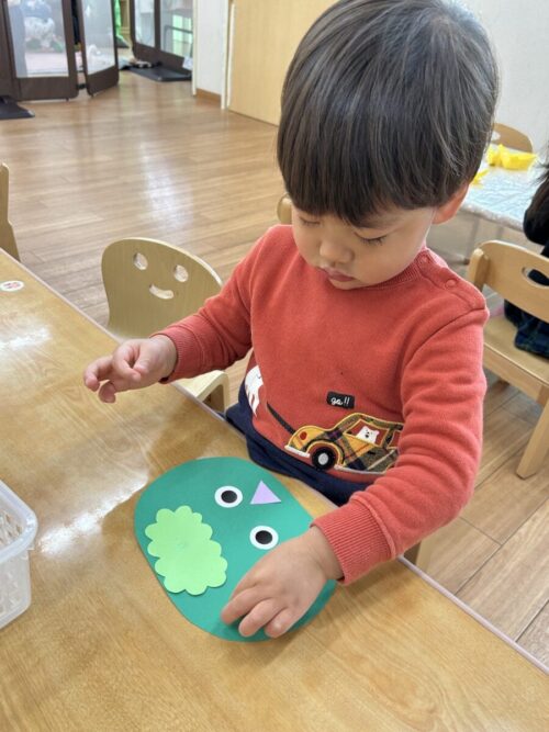 もも組さんとみかん組さんは、鬼のパーツをペッタンしました❗️