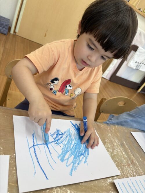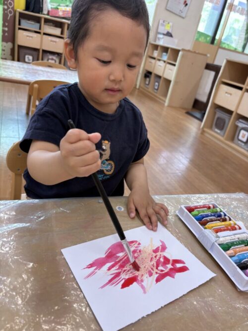 自由にお絵描きをした後、好きな色の絵の具を使ってはじき絵もしましたよ〜!