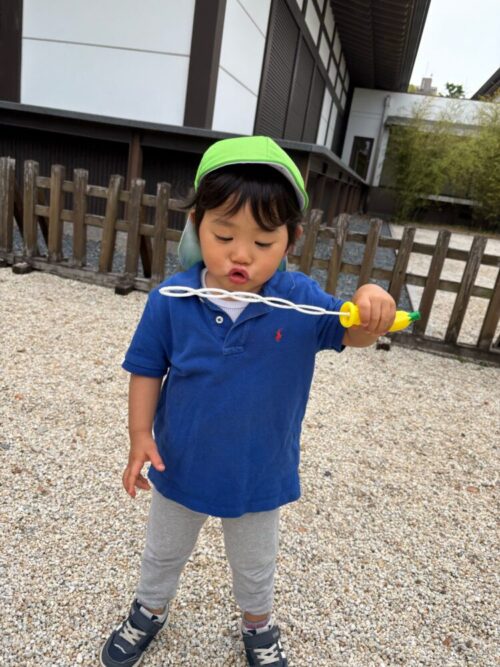 先生が飛ばしたシャボン玉を追いかけたり、自分でフ〜ッとして飛ばしてみたりしていましたよ😆