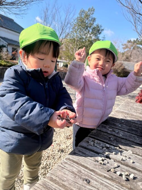 木の実や枝、落ち葉などの自然物を拾ったりして楽しむ子どもたちでした😊