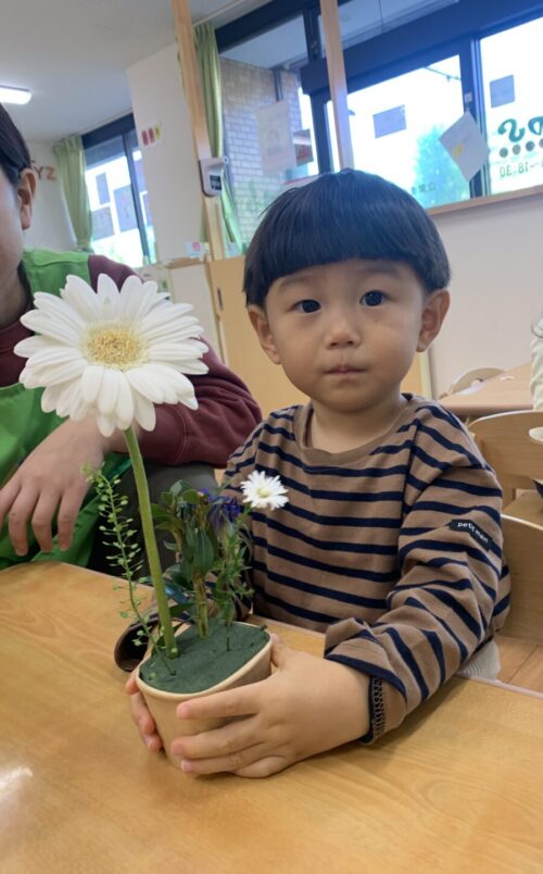 バラやガーベラがあり、華やかでかわいいものができあがっていましたよ✨