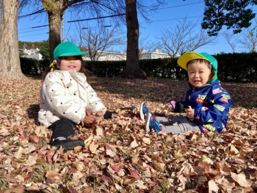 落ち葉の上で座るふたりの足に落ち葉をたくさん乗せると大喜びでした😆🍂