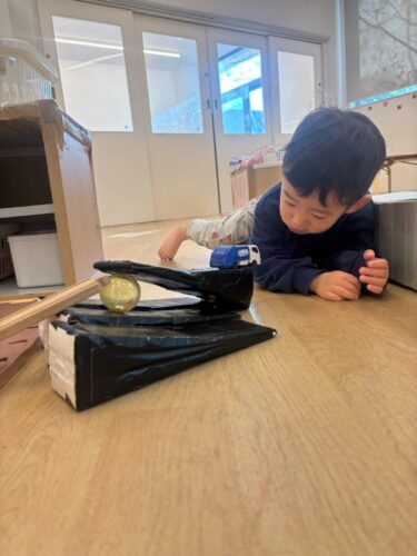 線路やパックを組み合わせピタゴラ装置を作り車を走らせるお友だち🚙