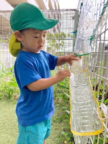 ペットボトルで手作りしたジョウロや坂道に興味津々!