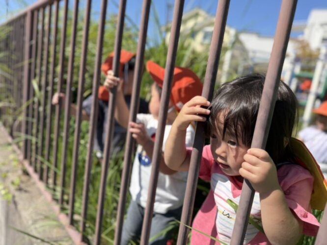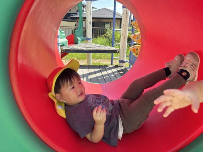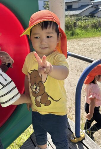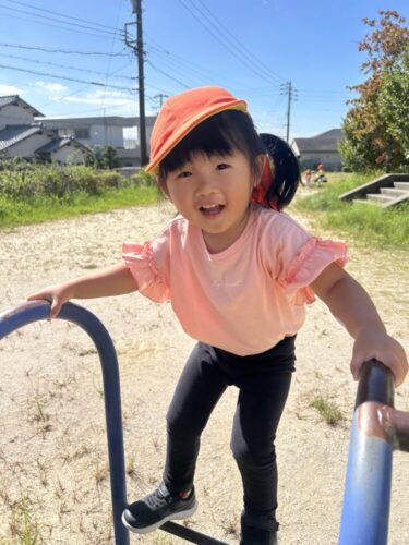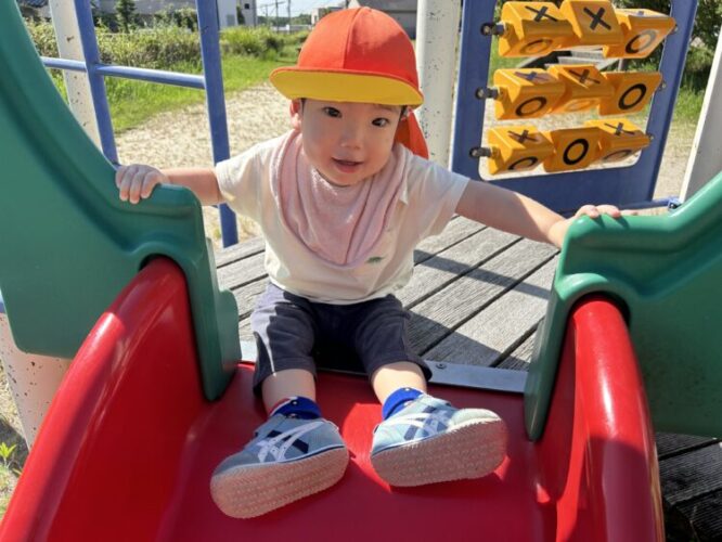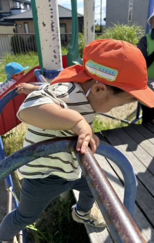 つい数ヶ月前までは、保育者の手を借りてのぼっていましたが、少しずつ、自分の力でのぼる様子が見られてきています🥹