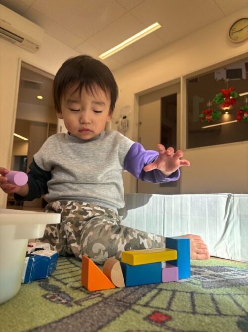 サンタさんにもらった玩具で上手に積み上げて遊んでいるお友だち![]()
