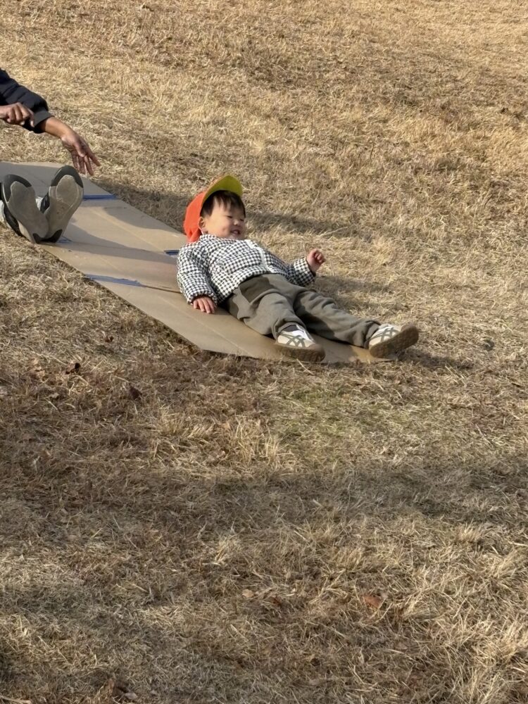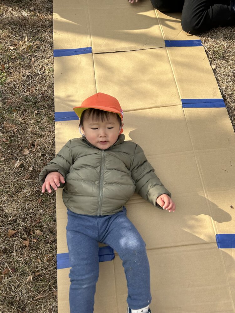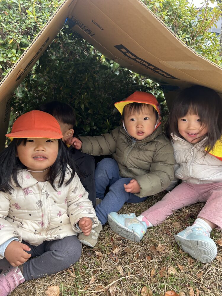 「先生、みてみて〜、」ダンボールのお家ができあがってみんなで休憩中💕 仲良く鉄棒にブラ〜ン😍腕力も強くなり鉄棒に足を上げてぶら下がってすごいですね😌今日もたくさん遊んだね!明日も元気に遊ぼうね💕