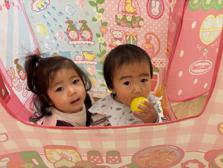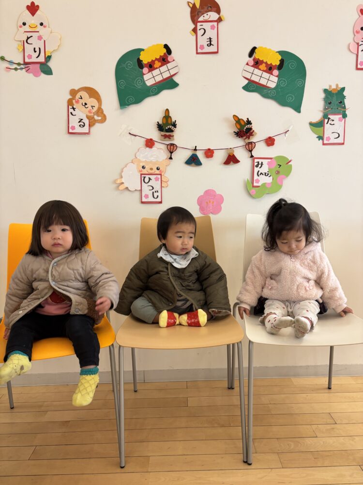 ひよこさんはお部屋やテラスで過ごしました🐥干支のお飾りの前でパチリ📷3人大きな椅子に座って可愛らしいです🥰