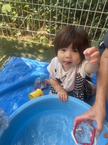 お水に触れる0歳児さん。