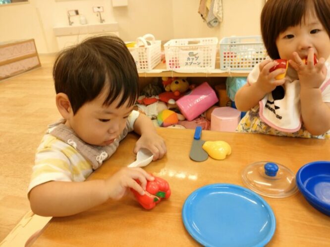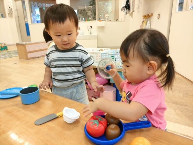 こちらは、お野菜の色や形を不思議そうに観察しているお友だち🌱