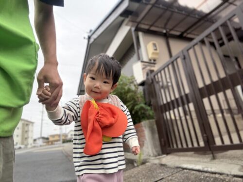 園長先生と保育園の前にいる大きなカボチャさんに元気な声で行ってきますを言って、早速出発です🛫