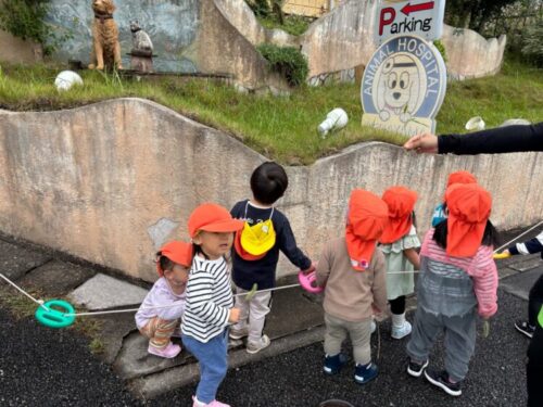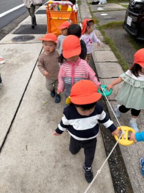 今日はあいにくの雨模様☔️ですが、お散歩の時間はちょうど雨が止む予報に🙌お砂場遊びは後日にして、今日は園周辺をお散歩することにしました🚶