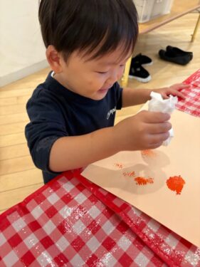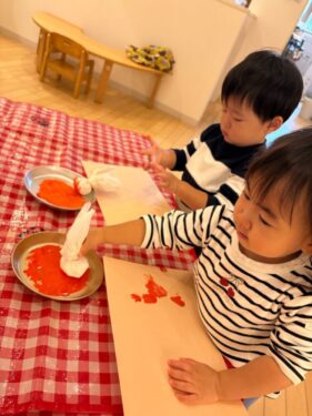 お散歩が終わった後は、ハロウィン用の製作をしました🎃お手製のスタンプを使って、絵の具をペタペタ押していきます🫷