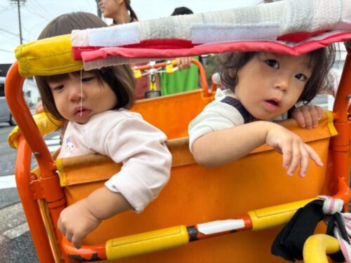 カートに揺られながらゆったりお散歩🚶横断歩道を渡る時に、「車来るから手あげるよー‼️」と伝えると、あひる組さんたちと一緒に一生懸命手を上げる姿がとてもかわいいです🥰