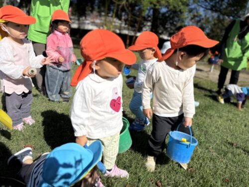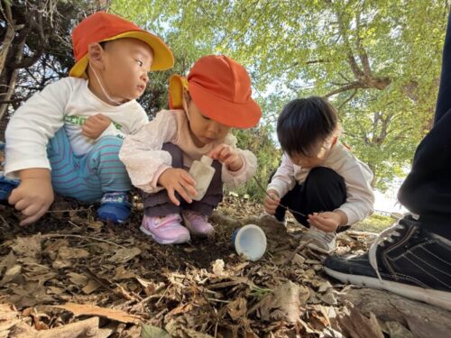 「ダンゴムシ探す❗️」と木の下を見ていると、まんまる小さな木の実を発見💡「自分も探す‼️」といつのまにか木の実探しが始まりました😊コップやボトルに見つけた木の実を入れて、「見て見てたくさん❗️」と保育者に見せてくれました🙌