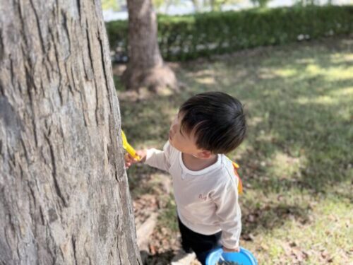 公園遊び後半戦は虫探しです🔍公園中を探索していると、木の上から蜘蛛が降ってきました😳木の皮に隠れてしまった蜘蛛を「スパイダーどこ❓」とスコップを使って探していました🥰