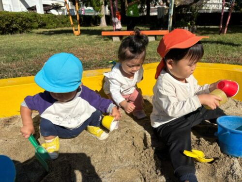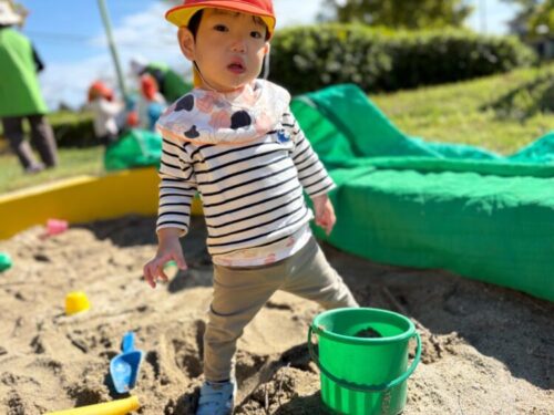 植田山公園に到着🛬さっそく砂場遊びをするひよこ&あひる組🐣🦆バケツの中へ一生懸命に砂を入れていきます✨