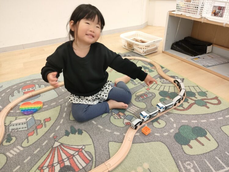 お部屋ではサンタさん🎅からもらった電車🚃で長い線路を作って電車を走らせるお友だち☺️「長いよー❣️見て見て」
