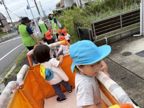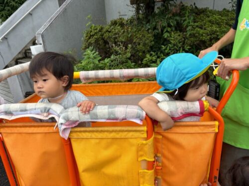 ひよこ組さんはカートに乗ってのんびりと過ごします🛒今日はバスに消防車、ヘリコプターとたくさんのカッコいい乗り物に会うことができました🚁「〇〇いたよ‼️」と保育者が伝えると、ひよこあひるぐみみんなで「おおぉー❗️」と喜んでいます🐣🦆