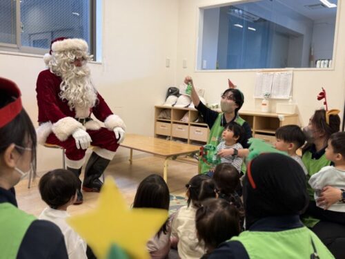 演奏会が終わり、ドアの外を見るとそこにはサンタさんが‼️「メリークリスマス‼️」とお部屋に入ってきたサンタさんに大喜びのひよこ&あひる組さん🐣🦆「わー❗️サンタさん来たよ‼️」と部屋中大盛り上がりです✨