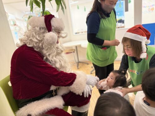 最後はサンタさんと記念撮影📸サンタさんが気になるひよこ&あひる組さんたち🐣🦆なんとか写真を撮ることができました😊