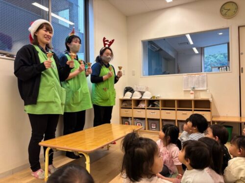 季節の歌では「あわてんぼうのサンタクロース」を、保育者の出し物では「きらきらぼし」のハンドベル演奏がありました🎹うさぎ組さんと一緒に大きな声で元気よく歌います🎤