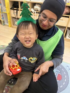 保育者のツリーの被り物を借りてハイチーズ📸飛び切りの笑顔で保育者もほっこり☺️サンタさんの到着を待ちます👀