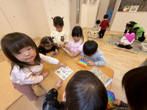 さっそく、サンタさんからもらったおもちゃで遊んでいきます✨虫とはたらく車のパズルやシリコン製のプチプチが大人気😊あひる組みんなで集まって楽しみます🎶