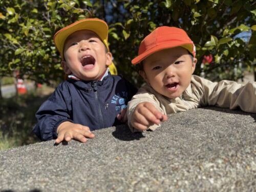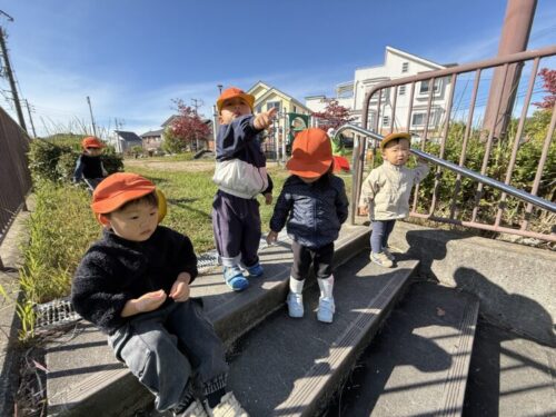 階段の塀でいないないばあをしました☺️お互いにびっくりしあって、みんなで笑顔に😊1人また1人と増えて、最後は5人でいないないばあをしていました✨