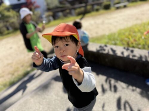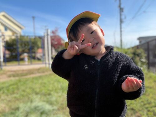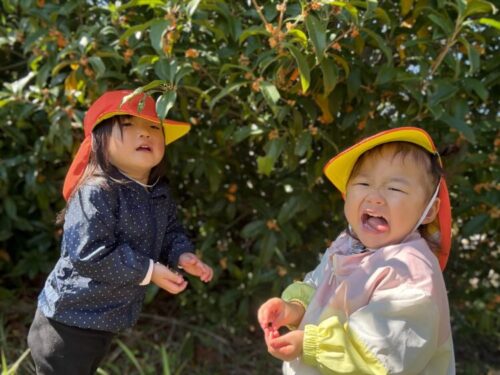 こちらも金木犀をゲット👏保育者が「見ーせーてー❗️」とカメラを向けると、ピースでとても可愛いポーズをしてくれました✌️