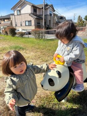 ひよこ組たちはパンダさんに乗って遊びました🐼順番こでパンダさんに乗って、待ってる間は押してあげていました✨仲良し2人組です🙌