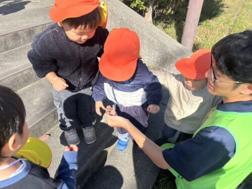 階段で遊んでいると、お友だちの服に蛾がくっついていました😳保育者が捕まえると、そこから鑑賞会が始まりました👀「見せて‼️」「私も触る‼️」と意外と怖がることなく、触れ合いを楽しんでいました☺️
