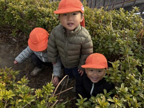 生垣の後ろでかくれんぼをするあひる組さん🦆「もういいかーい‼️」とまさかの隠れているあひる組が掛け声をしていました🥰そんなバレバレの3人組を見つけると、「キャー‼️」と嬉しそうに声をあげていました☺️