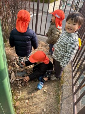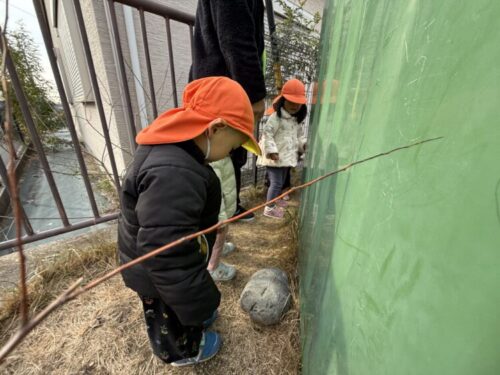 「食べられちゃったら大変‼️」ということで、みんなで隠す場所を探します🔍どこにしようかと見つけたのは器具庫の裏でした👀「ここにするー‼️」と満場一致で賛成なあひる組さん🦆