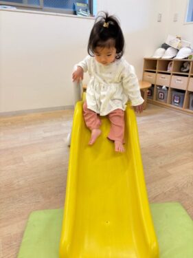 室内用のすべり台でも遊びました✨興味津々の様子で目をキラキラさせながらすべり台をすべるひよこ組さん🐥楽しそうに交代交代で仲良く遊べました🙌