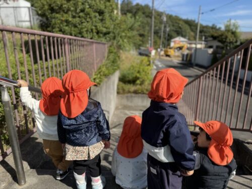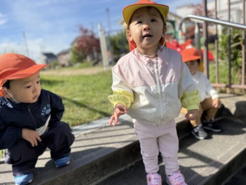 よいしょといつもの階段を1人で登ってニコニコなひよこ組さん🐣階段の先にあるポールにタッチして嬉しそうにしていました☺️
