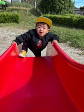すべり台を反対から登るのがブームのひよこ組さん🐣すべり台をすべってるお友だちがいる時は「反対から登ると危ないよー」と伝えるのですが、誰もいない時は挑戦を見守っています👀どこまで行けるかと見ていると、なんと最後まで登ることが出来ました👏「すごいね‼️」と褒めると、嬉しそうに手を叩いていました☺️