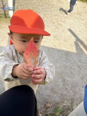 赤い木の実を探している途中、「見て❗️木に何かいるよ❗️ベロベロおばけいるよ‼️」と指を指して教えると「わぁ、ホントだ‼️」と驚き、いい反応を見せてくれるあひる組さん🦆