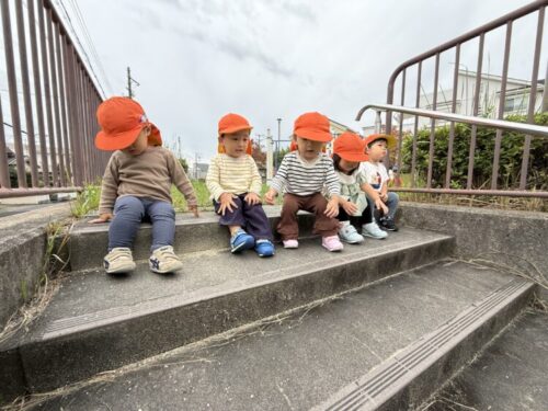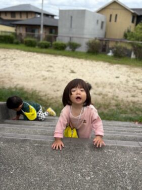 いつもの階段で遊ぶひよこ組さんたち🐣はいはいで力強く階段を登っていきます💪