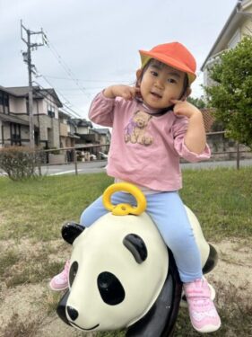 パンダさんに乗るあひる組さん🐼とても楽しそうな様子に「楽しいね☺️」と伝えるととても可愛いポーズでニコニコ笑顔を見せてくれました🥰思わず写真を撮ってしまいました📸