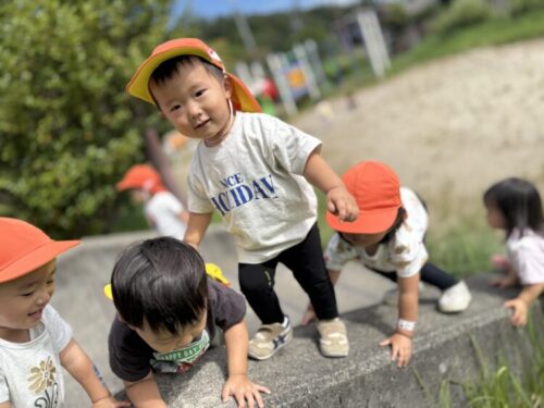 バッタさんは見つかりませんでしたが、途中の階段で遊ぶことに👀坂をよいしょよいしょと登って「やった〜‼️」と手を振ったり、すべり台のようにすべったり、みんなで全力で楽しむことができました✨