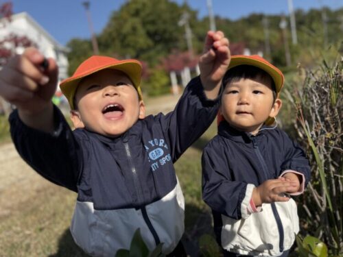 たくさんのモンキチョウが飛んでいたので、みんなで追いかける事に🦋「待て待て〜」と気づけば行き止まり…行ってしまったちょうちょに「飛んでっちゃったねー」と笑い合っていました🥰