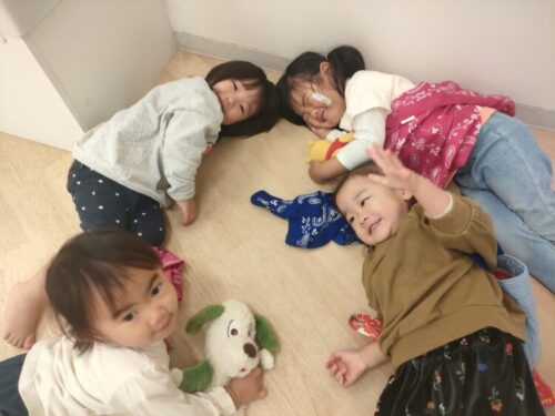 朝の時間、うさぎ組さんが使っていたお家を借りてみんなでごろーんTime💤三角巾を布団に見立てて寝転ぶ姿がとてもかわいかったです🥰