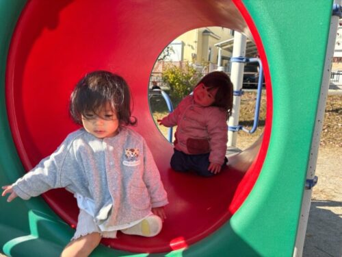 ひよこ組さんは2人仲良くすべり台で遊びます🛝赤いトンネルを上手に潜っていきます💪
